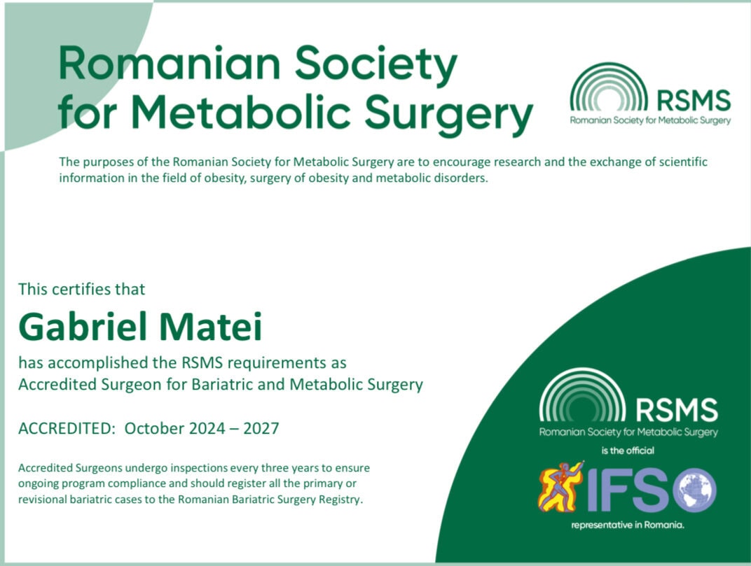 - ✔️ Membru IFSO (International Federation for the Surgery of Obesity and Metabolic Disorders)
